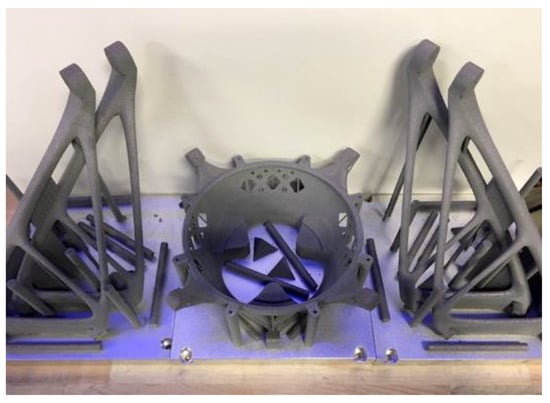 As can be seen in Figure 21, the design succeeds in terms of requiring minimal support structures to support extended overhangs, and it was possible to fabricate two legs simultaneously. After complete powder removal, the parts are removed from the plate with an EDM wire cutter. Hence, supports connecting the parts to the plate must have sufficient height to permit this subtractive removal process from the build plate.