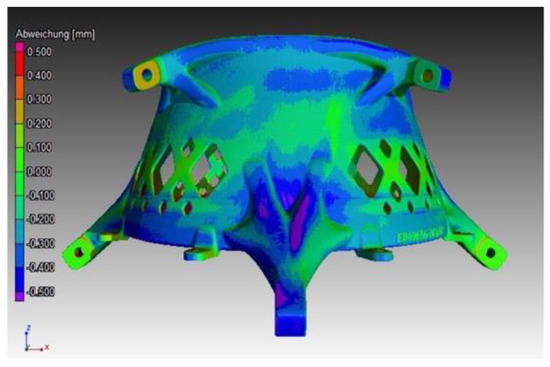 Overlay of nominal CAD geometry with fabricated part geometry obtained from CT scan data.