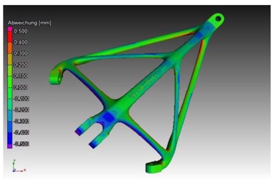 A 3D model was created from the Computed Tomography data of the printed part and compared to the CAD file from which it was printed. Overlapping the two files allows for the generation of heat maps in order to obtain a visual representation of the deviations of the fabricated component from the ideal geometry. The heat map is illustrated in Figure 12. It was found that the printed artifacts exhibited a tendency for small deviations on the downward facing edges with respect to the build direction, which can be attributed to the Additive Manufacturing process. This is because the downward facing edges are in direct contact with powder as opposed to solid, and powder is a less efficient thermal conductor than solid, resulting in significantly different heat transfer attributes between the down facing surfaces and the up facing surfaces. The maximum deviations between the Additively Manufactured part and the CAD data was measured to be under 280 microns. It is also noteworthy that the components were not required to be heat treated, as the measured deviations were within the design allowables specified by the customer. It is possible that a portion of the measured deviations are due to internal residual stresses in combination with the rougher downskin surfaces inherent to powder bed laser fusion. Hence, heat treatment may reduce the geometric deviations, however heat treatment will also be associated with reductions in ultimate and yield strength.