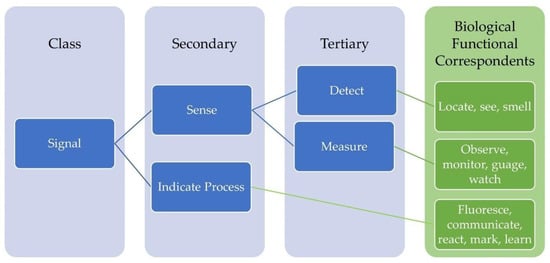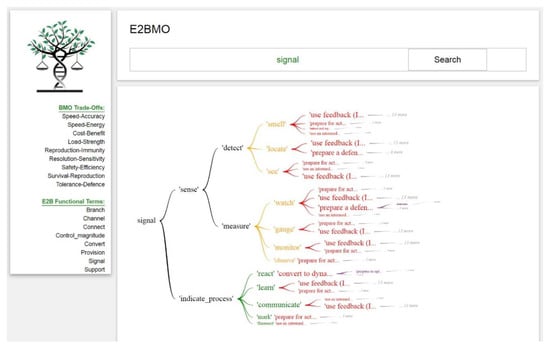The query of ‘Signal’ will result in a tree diagram (Figure 7 and Figure 8) that enables the user to navigate through the hierarchical structure of the Engineering-to-Biology Thesaurus selecting engineering related terms, in black, that are most suitable to their specific technical challenge. These terms are directly connected to corresponding biological functional words. For example, with our case study, the user may choose to query the engineering class ‘signal’ then select ‘sense’ as a more applicable engineering related term compared to ‘indicate_process’. ‘Sense’ is then further categorized to tertiary engineering terms, such as ‘detect’ and ‘measure’. These terms are directly correlated with biological functional correspondents, in green and orange (Figure 7), such as ‘see’ and ‘locate’.