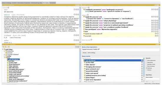 Results of querying the BMO for speed/accuracy trade-off within Protégé. Bottom right image shows ‘DL query’ tab with ‘Query results’, a list of Biological Models as potential solutions. ‘Ant decision’ is selected, thus information is provided in the description tab which outlines IPs attached to that specific biology strategy. The top left tab, ‘Annotations’, provides an abstract of the biological text containing the specific biological strategy identified. Note: to ensure this is the information retrieved from the query the user must know how to retrieve these specific tabs.