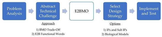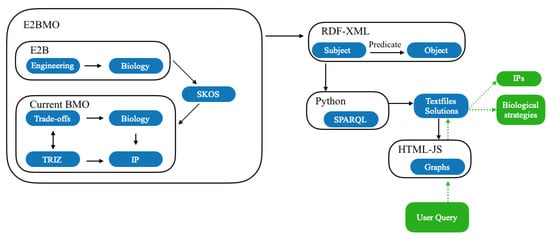 This paper is the result of a collaborative course that took place at the University of Akron and was composed of Integrated Bioscience Ph.D. students with diverse backgrounds including computer science, biology, physics, design, engineering, and architecture (four class members were Biomimicry Fellows, students actively working to integrate biomimicry practice into industry). Initially, we reviewed the biomimicry process and tools that support each step and identified a number of key points: (1) there are many tools available within the field of biomimicry, (2) these tools rarely cover more than one or two steps of the process, (3) the transition through the process or between tools is not facilitated, and (4) the more complex systematic tools, although useful, are too complex and largely inaccessible to potential users. Thus, two tools were selected that the team agreed effectively facilitated several steps, but if integrated, could further streamline the biomimicry process (Figure 1). Upon interviewing innovation consultants actively practicing biomimicry within an industrial context, the Engineering-to-Biology (E2B) Thesaurus [19] was selected, as it fulfilled our specific criteria for usability, accessibility, and cross-domain functionality. Our second tool of choice, the BioMimetic Ontology (BMO) [31], was selected as ontologies, due to their ability to organize complex collections of data, have proven to be successful across a variety of fields, including bioinformatics and medicine [32]. Therefore, an ontology that captures the intricacies of natural systems became the obvious tool of choice. The integration of such tools could bridge the gap between steps, therefore creating a more systematic process with direct access to identified and vetted biological strategies, opening up greater potential for biomimicry practice.