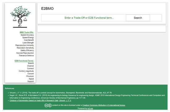 The Function–Behavior–Structure (FBS) Ontology and other related FBS models could also be useful for automatically searching and extracting information from literature to populate an ontology for biomimicry, or potentially aiding in front-end querying, for example navigating the E2B thesaurus hierarchy to narrow down functional search terms [40]. This aspect of keyword retrieval work is close-ended enabling the retrieval of a pre-convinced set output, such as a keyword. This is common with many other biomimetic tools but is only partially relevant to the E2BMO, since the E2B is essentially a keyword system. With the entire E2BMO, the retrieval is for a biomimetic database—in essence a compendium of biomimetic effects and solutions which have already been solved. The ambition of the E2BMO is greater in that it is designed to capture and support biomimetic novelty—i.e., discovering new biomimetic solutions and concepts, making it an open-ended tool. Related work includes that of Li Shu who uses an open-ended prompt system to search cases within a digitized biology textbook [41].