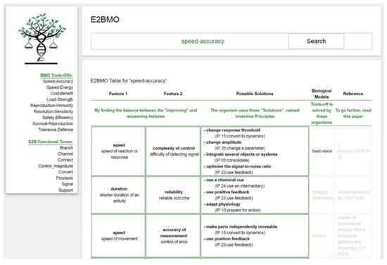 Here the user can choose one of the nine trade-offs currently suggested, under the ‘BMO Trade-Offs’ column on the left-hand side and type the one selected into the query box. The search engine then identifies IPs, biological strategies previously abstracted from the BMO and tagged as potential solutions for this specific trade-off. The results appear as a table (Figure 6). The main table presents, in the first and second column, the nature of the trade-off being solved. The third column provides the IPs and sub-IPs derived from biology as potential solutions. The second table contains references to the biological models that these strategies were abstracted from, if the user wishes to explore the biological content. This second table is greyed out to avoid confusion between the engineering related results and the biological models, but by simply moving the mouse over the cell, the content will become clearly visible (Figure 6). Figure 6 shows a subset of the definitions to the ‘speed-accuracy’ trade-off query; 11 examples are currently available in the BMO. The results appear on the same page and a user can scroll down to access the table for more examples.
