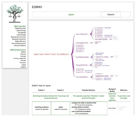Our efforts to link these tools aim to bring awareness to the copious tools available, and provide practitioners with a possible approach to more easily navigate through the biomimicry process and two selected tools. Therefore, the E2BMO could enable greater potential for future biomimicry practice. We demonstrate that the developed E2BMO website enables practitioners to both interface and extract information from the E2B Thesaurus and the BMO, especially in ways that were not possible before. We anticipate that this user-interface will give the average practitioner a more intuitive interaction with these tools, possibly increasing the usability of the biomimicry process, functional analysis, and an ontology. Users are encouraged to delve into each of the options available within the website and to freely navigate through the software to explore the innovative potential that each of these approaches offer. Through use of the E2BMO, practitioners will be able to better interact with complex biological knowledge without a heavy investment of time and energy, encouraging a more widespread implementation of biomimicry.