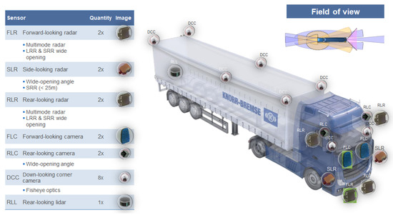 The task and responsibility of environment detection are joined in one subsystem. The vehicle is equipped with RADAR, LIDAR sensors and cameras that provide coverage in all directions (see Figure 1 for details). The placement of the sensors ensures redundancy; therefore, the sensor fusion can work more reliably. The perception module utilises additional sources of global information (for example, GPS signals, LTE and WLAN networks) and also has V2X communication capability.