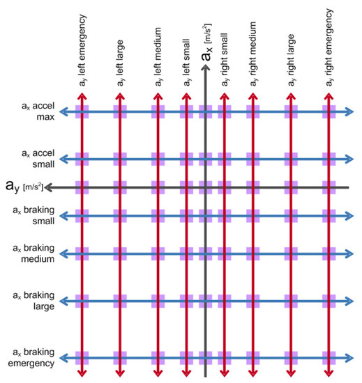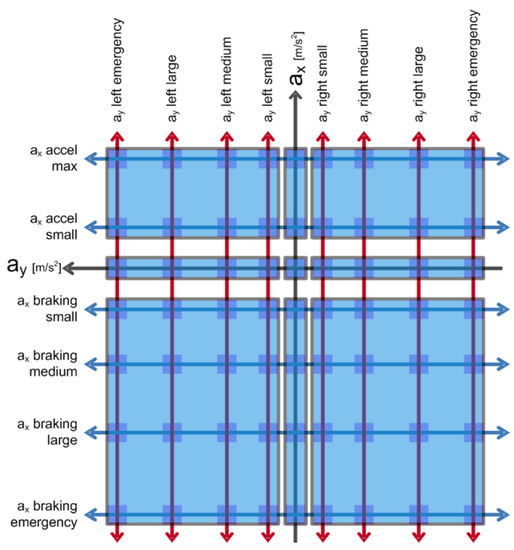 The above-mentioned manoeuvre space defines manoeuvres as points on a horizontal plane in the ego vehicle’s reference system. The axes of this coordinate system are the longitudinal and lateral accelerations. The origin shows the acceleration values which are needed to maintain current speed and keep the vehicle in the lane. The discretisation of this manoeuvre space currently considers manoeuvre points, as shown in Figure 2.