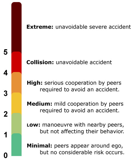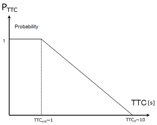 As a result of this, we can reduce the risk of some special cases to a small extent when collision can be just avoided with a little luck. Based on this, the TTC part of component P of the risk is determined by Equation (3), where the scalar value serves to scale the above-defined values in relation to the risk.