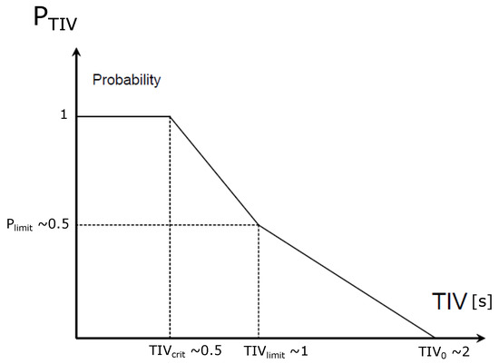 TIV is an abbreviation for time-in-between-vehicles (or inter-vehicular time). It is a risk characterisation parameter used in the automotive field [13,14]. It can be calculated by , where is the speed of the vehicle behind, and D is the longitudinal distance between the vehicles following each other. See Figure 6 for the connection between the value of the parameter and the probability of collision.
