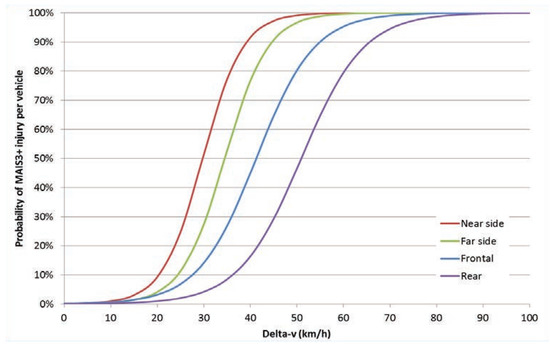We used method delta-v to determine component S, which was originally applied by Hobbs and Mills to evaluate the severity of human injuries [17]. Since then, this method has been used by several different studies [18]. For this, we need to determine the extent of the velocity change upon impact; then, by applying the extensively used curves [19], we can calculate the severity. The Abbreviated Injury Scale [20] (AIS) is a scale ranging from 1 to 6 which is used to indicate the severity of injuries. Equation (8) shows the probability of an injury with a severity of at least a level 3 on the AIS scale. This indicates the possibility of a clinically severe injury.