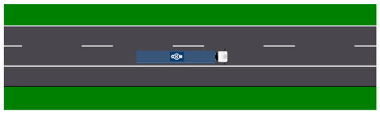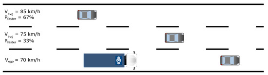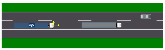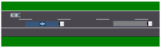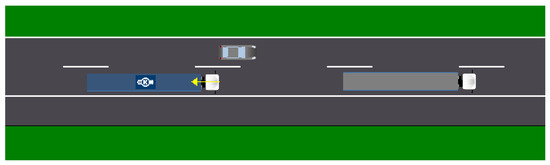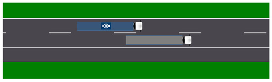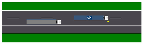 By the end of the 5th second, the car is in the position shown in Figure 16. Up to this point, we have slowed down to the speed of the truck ahead (which is 66 km/h). This (considering the status of the left lane) means that the probability of faster progress is 93%. Due to the possibility of moving faster and the obstacle in front of us, the probability of suitability of the left lane is also slightly higher than our lane’s (left: 88%, ours: 77%). The decision is made: we start to overtake.