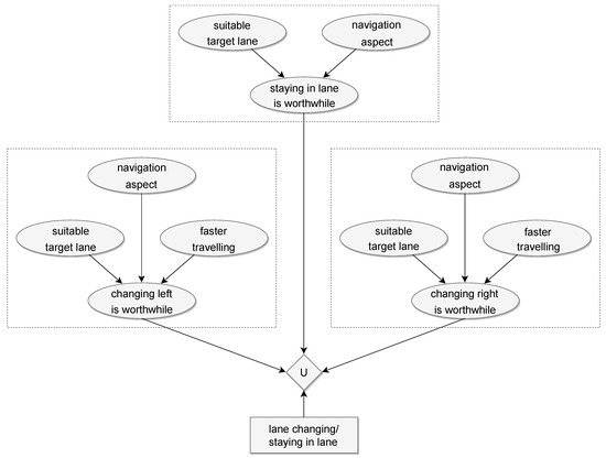 Using the listed inputs, we can draw a conclusion per lane. If it is worth changing to it (or, in the case of our own lane, staying in it), then using the probabilities thus obtained, we can make the most appropriate decision. The constructed network is illustrated in Figure 12.