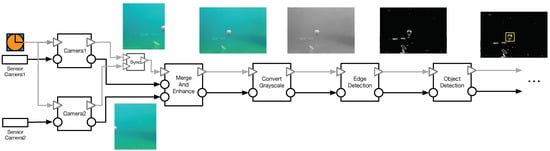 In the next paragraphs, we introduce a case study that will be used to present our solution. The case study is an underwater robot [] that autonomously navigates under water and executes various missions such as finding buoys. The robot is a typical embedded system that contains sensors (e.g., cameras), an embedded board with an incorporated GPU, and actuators (e.g., thrusters). An interesting part of the robot is the vision part which is described in Figure 1. The vision (sub-)system is developed with a state-of-practice component model i.e., the Rubus component model []. This particular component model follows a pipe-and-filter interaction style, where each component computes its received data and sends it to the next connected component(s). The vision system consists of six components as follows. The first two components (i.e., Camera1 and Camera2) receive raw data from two camera sensors, convert it into readable color (i.e., RGB) frames and forward it to the MergeAndEnhance component. After the two frames are merged into a single RGB frame and its noise is reduced, the ConvertGrayscale component converts it into a grayscale format and sends it to the EdgeDetection component. This component converts the frame into a black-and-white frame, where the white lines delimit the objects from the frame. Finally, the ObjectDetection component detects a particular object, such a buoys.