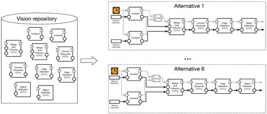Due to the fact that several components (i.e., MergeAndEnhance, ConvertGrayscale, EdgeDetection and ObjectDetection) have functionalities (i.e., image processing) that can be executed on the GPU, the vision system may have different alternatives. Figure 2 presents possible alternatives of the vision system. Assuming that we have a repository with ten components where there are components with the same behavior but constructed to be executed on different processing units (i.e., either on CPU or GPU). For instance, there is the EdgeDetection(GPU) component that is constructed to be executed on the GPU and there is EdgeDetection(CPU) that has the same behaviour but it requires to be executed on the CPU. The total amount of alternatives that can be constructed by using the repository components is six, as illustrated in the figure. The first alternative, where all components are executed on the CPU, has a low performance but also zero-demand on the GPU. This alternative can be selected to be used in a system that is not equipped with a GPU or in a system that possesses a GPU but it is used by a different part of the system. The last alternative, containing four components that need to be executed on the GPU, has the highest performance compared to the rest of the alternatives but it also has high GPU requirements (e.g., GPU memory and computation threads usage). The other four possible alternatives contain variations of components with different requirements on the CPU and GPU.
