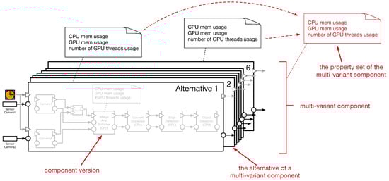 Figure 3 depicts the vision system alternatives compacted into a multi-variant component where each alternative is characterized by set of properties. These properties are derived from the properties of the enclosed components. For instance, the alternative 6 where there are four GPU-based components, is characterized by a GPU memory property that describes the GPU memory usage of the enclosed components. This property is derived by e.g., summing the GPU memory usage of all four GPU-based components. As the GPU threads are highly reusable between GPU-based components, the alternative property that describes the number of GPU threads usage is the highest value of threads usage among the four GPU-based components. Furthermore, some attributes may be abstracted away. For example, due to the fact that connected (CPU- and GPU-based) components are enclosed together into single units and implicitly they will be allocated on the same CPU–GPU chip, the bandwidth property required for data transfer between two connected components, is abstracted away.