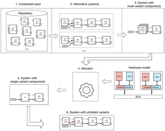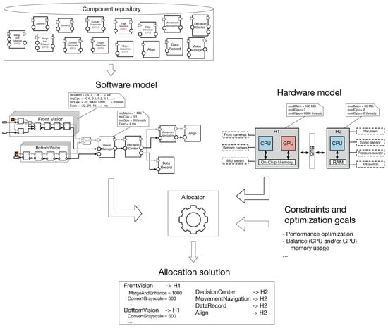 The growing complexity and size of embedded systems emphasizes the use of appropriate development methods that can cope with these issues and scale well. Component-Based Development (CBD) is a promising approach in this regard which promotes building a system out of already existing components, as opposed to building it from scratch. In other words, CBD enables reusability in software development by building a system as an assembly of components [,] selected from a repository of verified existing components. Considering the constraints of embedded systems in terms of available resources, how software components are allocated onto the hardware platform can play an important role in the performance of the system and optimal use of the resources. This is, however, not a trivial task and as the number of software components as well as processing units and computing nodes on the hardware platform increases, different combinatorial allocation schemes need to be evaluated in order to determine an appropriate one. For this reason, having an automated solution for evaluation of allocation schemes is necessary. One aspect that adds to the challenge of allocating software components onto hardware platforms is the move towards the use of heterogeneous hardware architectures such as multi-core CPU and GPU. Use of GPUs along with CPUs is particularly interesting as it can provide increased computation power and diversity due to the parallel processing capability of GPUs. This brings along additional constraints that need to be taken into account for allocation of software components to hardware. For instance, a GPU cannot be used independently of a CPU, and it is the CPU that triggers all GPU specific operations such as data transfer between the main memory unit (i.e., RAM) and the GPU memory system. Therefore, there is constant and high communication between these two processing units.