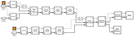 The bottom vision has a similar functionality. Due to the fact that there is only one camera, there is no need to merge frames. Therefore, to construct the bottom vision functionality, we reused four of the components developed for the front vision. In this case, there are: (i) four CPU-based components (i.e., Camera1, ConvertGrayscale CPU, EdgeDetection CPU and ObjectDetection GPU), and (ii) three GPU-based components (i.e., ConvertGrayscale GPU, EdgeDetection GPU and ObjectDetection GPU).