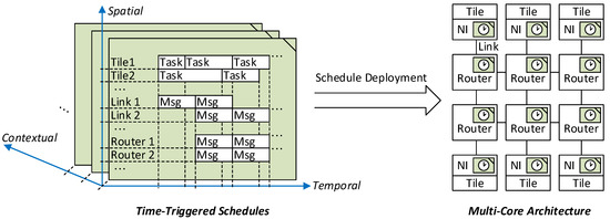 In order to realize these properties, a schedule encompasses three dimensions as depicted in Figure 1. The schedule defines in the temporal dimension when activities need to be dispatched with respect to the global time base. In the spatial dimension, the schedule defines the triggers for the different resources of the multi-core architecture such as Network Interfaces (NIs), routers and communication links. The third dimension corresponds to the contextual dimension, where different plans for the context events are distinguished. Overall, the time-triggered schedule thus defines what activities shall be dispatched for each resource and each relevant context event at which global points in time.