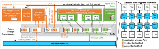 The remainder of the paper is structured as follows. Section 2 analyzes the challenges and requirements for adaptation in time-triggered systems. The ATMA is the focus of Section 3. Section 4 describes the computation of multiple schedules, each serving for certain context events. Section 5 introduces agreement services, which establish chip-wide consistent context information. The context information is used for adaptive communication in Section 6. Section 7 presents example scenarios and the experimental evaluation.
