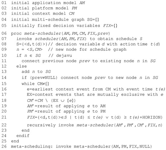 The algorithm of the meta scheduler is depicted in Figure 4. The meta scheduler starts in an initial state assuming the absence of faults, slack events and resource alerts. It invokes the scheduler to obtain a schedule for . The meta scheduler then performs a time step until one of the events from the context model can occur.