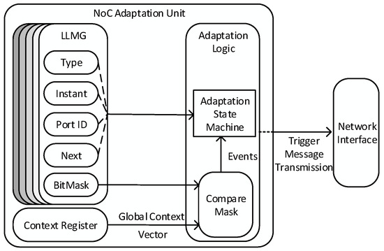 - The NoC adaptation unit contains multiple schedules and the next schedule is chosen based on the context information provided by the context agreement unit. The potential switching between schedules is triggered in a time-triggered manner and has its own schedule. Since the context information is chip-wide consistent, it is guaranteed that all tiles perform aligned schedule changes.