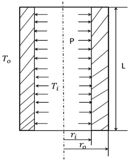 A thick-walled cylinder pipe carrying high-temperature liquid is considered. The fluid inside the pipe was assumed to completely fill the pipe and exert a constant pressure P. The analysis was carried out in the 2-D plane of the cross section of the pipe (see Figure 1).