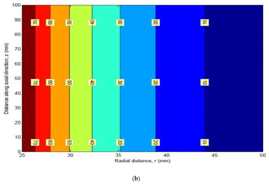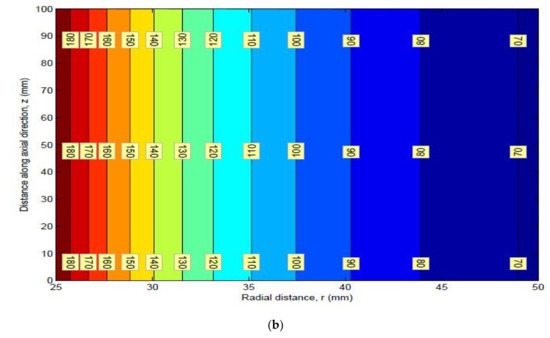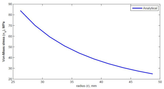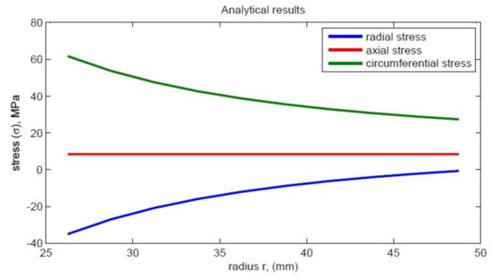 The dimensions of the thick pipe section were taken as L of 100 mm, of 25 mm, and of 50 mm. The material properties of HK40 are given as follows: elastic modulus Pa, Poisson’s ratio of 0.313, thermal expansion coefficient . The obtained values of the radial stress, circumferential stress, axial stress, and von Mises stress are shown in Table 1. Graphs of different stresses vs. radius are shown in Figure 2 and Figure 3.