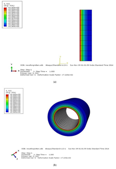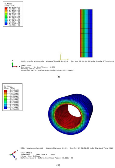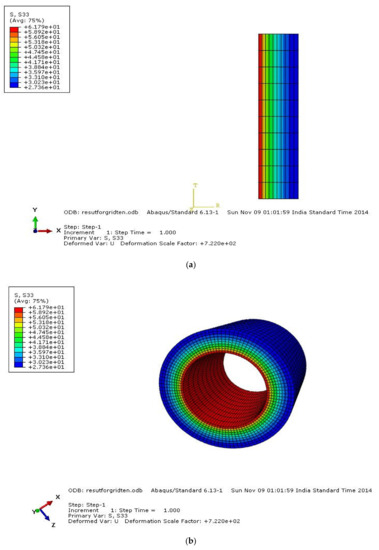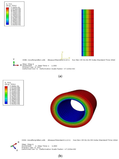 A pipe made up of HK40 material was considered with a pipe length L of 100 mm, inner radius ri of 25 mm, and outer radius r0 of 50 mm. The material properties are elastic modulus (E) of 1.38 × 105 MPa, Poisson’s ratio µ of 0.313, coefficient of thermal expansion (α) of 1.5 × 10−5 (1/°C). The model was meshed with element type CAX4R, a four-noded bilinear quadrilateral element, and the mesh grid was 10 × 10 elements and was fixed in the axial direction U2 of 0, as shown in Figure 4. The loading conditions were internal pressure P = 40 MPa, inside temperature of 500 °C, outside temperature of 420 °C, thermal gradient of 80 °C. Figure 4 shows the model with meshing and applied boundary conditions in ABAQUS. Analysis on the sweep of different stress elements before and after analysis is shown in Figure 5, Figure 6, Figure 7 and Figure 8 below, along with comparisons of various stresses which are shown in Figure 9, Figure 10 and Figure 11. Table 2 and Table 3 show the comparisons of analytical and finite element analysis (FEA) using ABAQUS results by using von Mises stress.