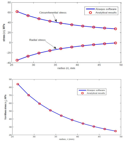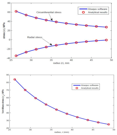 Radial and circumferential stress, and von Mises stress.