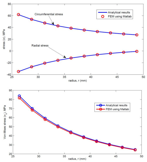 Several examples were solved to show the accuracy of the analyticalsolution in comparison with the FEA usign MATLAB analysis. Both stress distributions such as the circumferential and radial stresses were obtained.Circumferential stress gradually decreases and radial stress, von mises increases as shown in the Figure 10.