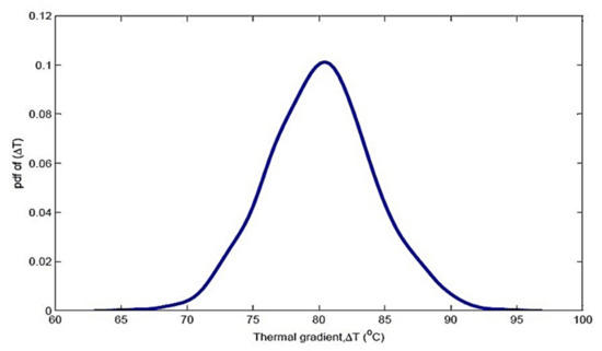 Variance = , coefficient of variance = 0.05, inside temperature was varying and outside temperature was kept constant, and thermal gradient was normally distributed with mean and standard deviation of 80 and 4, respectively. The nominal distribution of the thermal gradient is represented in Figure 14 below.