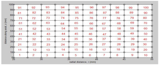 The development of a probabilistic finite element formulation for the axisymmetric pipe section was based on an available procedure for determining the finite element analysis of an axisymmetric pipe section. The axisymmetric section of the pipe used for finite element analysis was discretized into ten finite elements in the radial direction and 10 elements in the axial direction, and the geometry of the FE mesh is shown in Figure 15 below.