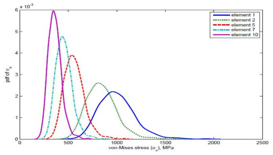 In order to characterize the material variability on the cyclic stress–strain and strain–life responses of the various elements under multi-axial fatigue, the various random variables were calculated. A comparison of various stresses is shown in Figure 16, Figure 17, Figure 18 and Figure 19.