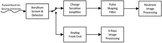 The detector is a p-i-n (p-type semiconductor/n-type semiconductor with wide intrinsic semiconductor in between) photodiode that is switched between the X-ray Image Processing Unit and the Neutron Image Processing Unit. Initially it is connected to the X-ray detector AFE that enables the S/H units exactly before the plasma focus is ready for emission. After the emission the X-ray image information is almost instantly stored on the AFE S/H units. The p-i-n photodiode is then switched to the charge sensitive amplifier. The neutrons arrive at a time that depends on their energy and the distance of the imaging device from the neutron source. The neutrons interact with the beryllium Screen that is activated with a half-life of 800 ms. After 2.5 sec almost all the beta particles that are produced from the activation will pass through the p-i-n photodiode. Each time a beta particle pass through the photodiodes depletion region, charge is produced and stored to Charge Amplifier’s capacitor, producing a pulse on its output. This pulse is shaped with the use of a Pulse Shaping Filter. In this way, the pulse to noise ratio is increased and the pulse becomes detectable.