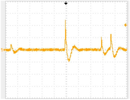 Oscilloscope image of several pulses in the output of the pulse shaping filter circuit. Vertical scale is 2 V/division, horizontal scale is 250 microseconds/division.