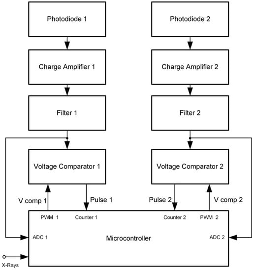 Each photodiode in the imaging array formulates a pixel in the imaging device and thus requires its own independent circuitry for pulse counting. A low cost ultra-low power microcontroller (MCU) is capable of handling 2 pixels. So the basic unit for the neutrons image processing consists of two photodiodes and their respective analog circuits (charge amplifiers, pulse shaping filters and voltage comparators) and one microcontroller. Each microcontroller has also an input that is fed with signal from a dedicated photodiode that measures the time of arrival of the X-ray pulse. The time difference of the first beta particle pulse of the whole sensor and the arrival of the X-rays can give a good estimation of how far away the neutron source is for 2.45 MeV neutrons. The block diagram of the basic unit for the neutrons image processing is shown in Figure 3.
