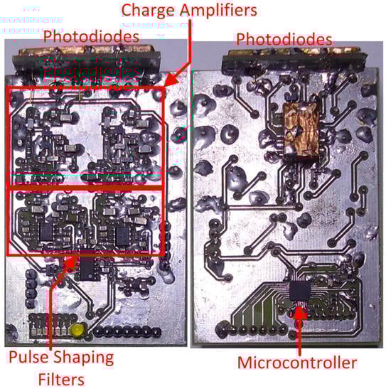 The microcontroller counts the pulses from the two comparators outputs. In order to avoid false counts the threshold voltage of each comparator must be above the noise level of the pulse shaping filter output. For this reason, before the system starts counting, the microcontroller reads continuously the analog output of each pulse shaping filter, calculates the maximum noise value Vn and sets the voltage comparator thresholds 20% above Vn. The pulse shaping filters have a central frequency of about 15 kHz and the sampling rate is at least an order of magnitude higher. The threshold voltage of each comparator, produced by one internal PWM unit of the microcontroller, feeds the comparator’s threshold input through a passive low-pass filter. A close view of an experimental basic unit for the neutrons image processing is shown in Figure 4. Shielding is significant close to the photodiodes, as the signals are very low and noise can affect strongly the operation of the circuit.