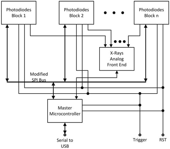The microcontrollers of the basic units for the neutrons image processing allow local pixel processing and give smart capabilities to the image sensor. All of them are slaves on a microcontroller network that communicates using a high speed modified bidirectional SPI Bus and a specific protocol that was developed for this purpose. A dedicated master microcontroller is controlling the network communications and is capable of giving orders to all or each one of the slave microcontrollers. The master microcontroller communicates also with a PC through a RS232 to Universal Serial Bus (USB) port and collects the data from both X-rays and neutrons imaging units. In addition, two more signals are used, the reset (RST), in order to reset the slave microcontrollers, and the trigger that initializes the image sensor. This trigger can be used to synchronize the detector with the plasma focus radiation emission when more than one shots are required to form an image [14]. When the slave receives the trigger pulse, it connects the photodiodes to the X-rays AFE. Once the X-ray image has been captured, it connects the photodiodes to the charge amplifiers in order to start the counting of the pulses. The communications block diagram is shown in Figure 5.