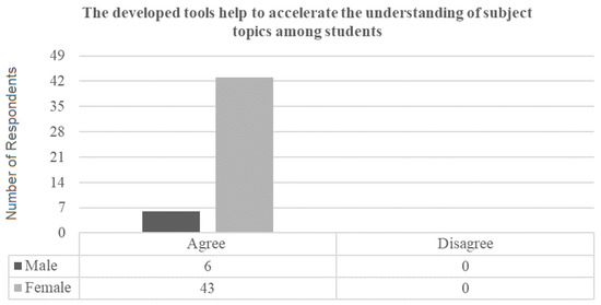 To know the opinions of the students regarding the improvement of their learning experience after using the developed tool, the following chart is plotted in Figure 5. This figure depicts that all respondents agree that the developed tool helped them to accelerate their understanding of the subject topic. The results showed that the developed tool is an essential tool that can an aid in the TLA process.