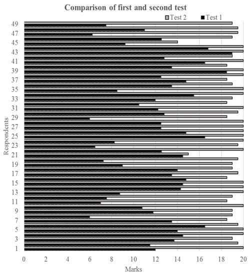 Regarding the answers to the second question, it is found that they have a very strong majority opinion of the statement that the developed tool helps to accelerate their understanding of the topic of the mentioned subject. This indicates that the students consider that the tool has helped them to increase their learning process, which has also been more autonomous. This can be verified by comparing the result of the first and second test. Figure 6 showed that there is a gradual improvement of test results with a 2.5–65.3% enhancement with an average of 35.6%.
