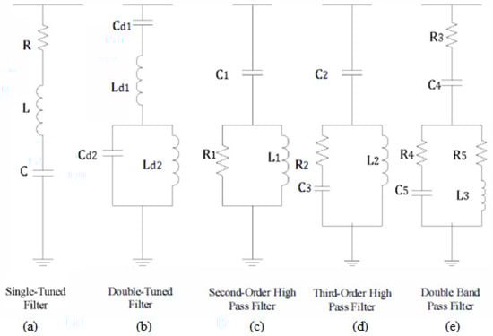 In recent years, there have been serious concerns regarding the quality of available power in electrical networks, making this issue a significant focus of research interest for both suppliers and users. Power system harmonics are considered one of the most important issues because of their reduction in power quality in power systems [1,2,3]. This is due to the widespread nonlinear loads exhibited across different appliances (such as variable frequency drives and switching mode power supplies), which can result in distortion currents with a frequency greater than the fundamental frequency. These harmonics can have detrimental effects on other components of the power system across all electrical sectors. Some of these effects are immediate (i.e., noise, interference, and control circuits, etc.) while others are long-term (i.e., heating due to extra power losses, damage). Furthermore, they lead to the degradation of the load power factor and higher transmission line losses, and thus contribute to a reduction in the efficiency of the transmission network. Thus, it is clear that harmonic levels should be minimized by all participants in the electrical grid [4,5,6,7]. There are different approaches to mitigating the effects of harmonics problems, such as load conditioning, which ensures that the electrical equipment is less sensitive to power disturbances. Other approaches used involve adding filters to the line power system, either in series or shunt connections. Harmonic mitigation techniques such as the K-factor transformer and shifting transformer are also applied in order to limit the power quality problem [8,9,10]. Industrial electrical systems contain the majority of medium- to high-powered contaminant sources, often in the form of static power converters and electric arc furnaces. In such systems, single objective filter solutions are usually preferred, to attempt to comply with the relevant power quality standards while incurring the least costs [11]. Adding harmonic filters (passive and/or active) is the most frequently used approach [12,13,14,15,16]. Further, passive filters are deemed to be the most effective and viable solution for mitigating harmonics in power systems. Therefore, they are broadly used in transmission and distribution power systems due to their simple design, cost effectiveness, simplicity in maintenance, and high reliability. Passive filters are characterized by having a dual purpose, reducing current harmonics and correcting the power factor (PF). Therefore, they have been recommended for reducing nonlinear current loads, especially for existing industrial users [6,17,18]. On the other hand, employing passive filters may introduce resonance into the power system; thus, they should be designed such that they are safely located away from existing power harmonics [19,20]. Passive filters can be classified into two general categories, namely (i) tuned passive filters, (single-tuned or double-tuned filters) and (ii) high-pass passive filters. These filters typically have two types of connection, either in series, which presents a high-impedance series path, or as shunt, which presents a low-impedance path. In this context, a shunt connection is generally preferred and used more often for harmonics reduction than the series connection due to its ability to support a range of voltages while also compensating reactive power at the fundamental frequency [2,6,21]. Figure 1 presents several configurations of shunt passive harmonic filters [17].
