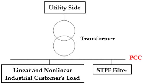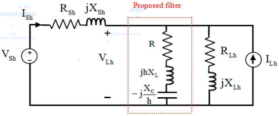 A typical industrial power system, such as the one given in Figure 2, is considered to describe a novel approach based on NLCI. The configuration used is similar to that used for a single-line design of single-tuned passive filters using the response surface methodology [24], it comprises a transformer, the consumer loads (which include both linear and nonlinear loads) and the STPF filter connected to the PCC. Figure 3 describes the single-phase equivalent circuit of the industrial system under study with the novel shunt STPF providing compensation. In this circuit, the background voltage harmonic components are taken into account; these are represented by VSh. These voltage harmonic distortions affect a load bus at the PCC, which is which may be already suffering from extra current harmonic distortion due to nonlinear loads associated with the power distribution in the network.