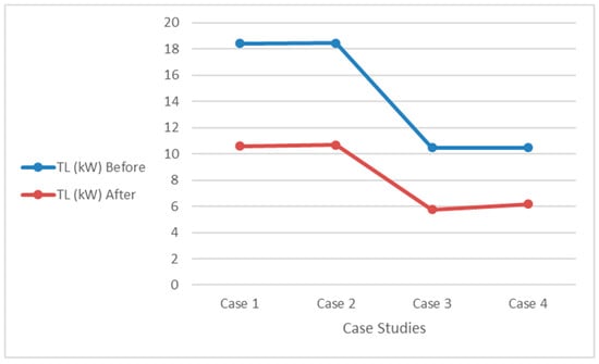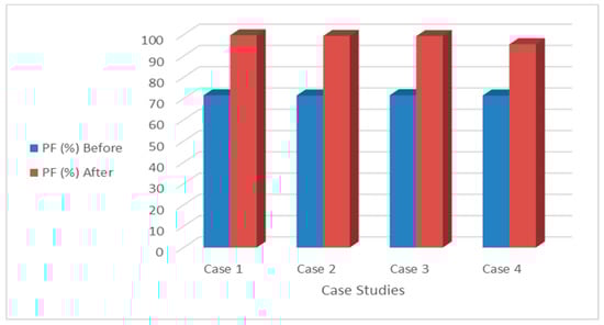 Transmission power losses can be reduced by correcting the power factor. Hence, the objective function of the filter design is subject to a constraint of 90 % ≤ PF ≤ 100 %. For all case studies, Figure 5 and Figure 6 show improvements in PF and reductions in transmission power losses respectively. For Figure 5 a reduction in transmission power losses for all case studies is attributed to the improvement in PF.