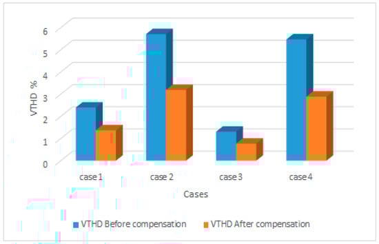Figure 7 shows a comparison of the VTHD results for the four case studies before compensation and after, when incorporating the objective function of minimizing NLCI as an objective function. Lower VTHD values are achieved in all the cases studied, showing the quality of the PCC voltage is also enhanced in each case. This is explained by an increase in the fundamental harmonic value of the voltage for all the case studies and leads to the conclusion that harmonic voltage components are considerably reduced, compared to the uncompensated components in each case. Figure 7 also shows clear improvements by reductions in all the tested load harmonic voltages, in cases 2 and 4, which follow from the application of our optimization method.