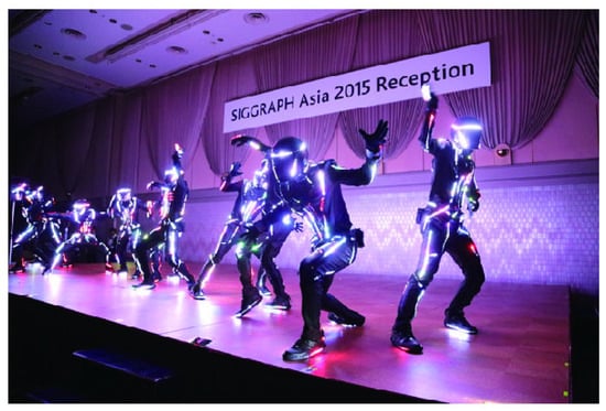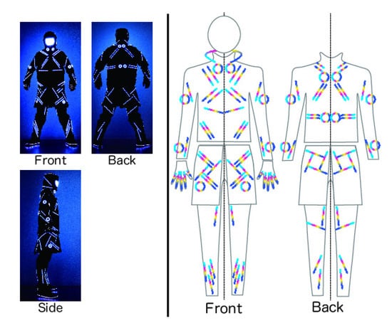 With advances in wearable technology, LED costumes can be used at venues such as theme parks and music concerts. In the electrical parades held at Disney theme parks [3], large LEDs are arranged on the dancer’s costume to avoid more movable body parts. Fujimoto et al. [4] developed an LED-costume-control system for dance performances. At live events, LEDs on the costumes turn on in a pre-programmed pattern, which is very simple, but thanks to their performance system, more delicate performances are now possible.
