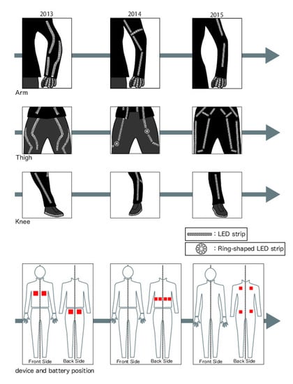 Live entertainment has been developing rapidly with advances in technology, and various technology-based performances have been produced. With rapid computer miniaturization and sophistication, costumes with wearable technology have been used in various performances. In particular, costumes on which illumination materials, such as light emitting diodes (LEDs), are sewn or pasted have been used in many live performances [1,2,3]. By controlling the timing/color of the lighting to the music and choreography [4], highly impactful performances can be staged. We previously fabricated an LED costume on which many LEDs are attached, and developed a live performance system for controlling the timing/color of the LEDs to the music and choreography. We also used LED costumes more than 120 times during large concerts of well-known artists at venues of approximately 50,000 capacity that were commercially successesful. Thus, a large amount of knowledge about using LED costumes were gained. We are using these LED costumes at live concerts that are being held now. If the detail of the LED costumes is described, it is possible to publish a part of the live concerts. Consequently, in testing out the LED costume design in actual concerts, we needed to conform to the non-disclosure conditions in ongoing concerts. Therefore, we describe the LED costume as possible. To achieve maximum performance when using an LED costume, the best LED positions and wiring for ease of dancing should be determined in terms of light expression without decreasing the quality as a stage costume. Also, in a dance performance with powerful movements, failure of LEDs and control devices cannot be avoided. Thus, it is necessary to have a costume design in which LEDs can be repaired promptly. Although conventional LED costumes have been designed to prevent LED failures, no costume design takes LED maintenance into account. For making LED replacement easy, costumes with many long and narrow pockets for storing LEDs have been seen [1,5]. The front is fabricated of mesh, which allows seeing the light. Although conventional LED costumes must have sewn or glued LEDs, in this case LEDs are just put in these pockets. However, there are still many problems with conventional LED costumes such as having to take off the costume every time LEDs need to be repaired. Besides, popular artists hold concerts at multiple venues, and some artists hold concerts more often throughout a year. Therefore, designing a costume for long-term use without decreasing the quality as the stage costume is important. We updated our costume design from the experiments gained from using it in the above concerts. Hence, in this paper, we propose design guidelines for fabricating LED costumes for dance performances during large and long-term concert tours through our experiments. As follows, lighting costume technology is introduced in Section 2, and design guidelines for a wearable computer is described in Section 3. In Section 4, we describe the qualitative improvement of LED costume based on our experiences of using LED costumes at live concerts. In Section 5 and Section 6, analyses of LED failures are conducted. Then, we propose the design guidelines on LED costume for dance performances in Section 7. In Section 8, the new LED costumes fabricated based on our proposal are introduced, and endurance testing involving dancing is conducted. In Section 10, dance performances using the LED costume fabricated in Section 8 are introduced. Finally, this paper is concluded in Section 11. Additionally, the contributions of this research are as follows.