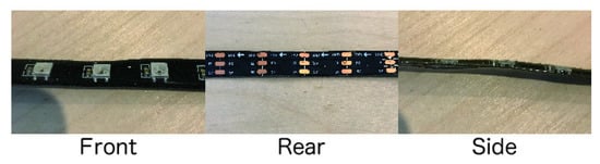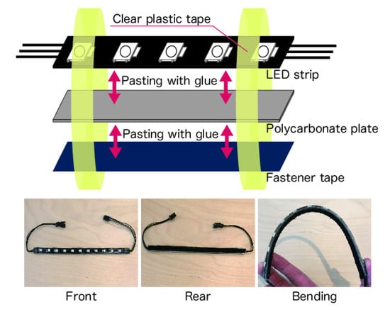 We fabricated a new LED costume based on the design guidelines proposed in Section 7. This costume is shown in Figure 9. It uses 1180 LEDs, consisting of 2 types of LED units and ring-shaped LED units. One uses addressable LED strip that consists of 11 LEDs. The LED source is a 5050SMD built-in SK6812 chip, and PCB thickness is 0.25 mm. The other uses addressable LED strip that consists of 6 LEDs. The LED source is the same as the former. The ring-shaped LED unit source is 5050SMD built-in SK7812 chip, and PCB thickness is 1 mm. The inner diameter is 30 mm, and outer diameter is 45 mm. Each LED unit can be connected with a JST SM connector. There are 94 LED units, which is more than for the previous LED costumes we fabricated. The LED costume fabricated in 2013 used 500 LEDs and 32 LED units, the LED costume fabricated in 2014 used 854 LEDs and 60 LED units, and the LED costume fabricated in 2015 used 867 LEDS and 32 LED units. Thus, the wiring of the new LED costume is more complex. The main fabric is nylon that is soft, light, and quick-drying, and the inner mesh is attached to wear easily without the cable and connector touching the wearer’s skin. The inner mesh is also washable. The pants are integrated with the skirt on which the LEDs are attached. The LED units around the thigh and hip that can easily break are arranged so as to not bend. Placing LED units around the joints is avoided as much as possible. Ring-shaped LED units are used instead. A ring-shaped LED unit has a hard circuit board; thus, it is difficult to break. The fastener tape is sewn onto the surface of the costume, and the buttonholes are opened at the ends of the fastener tape. This enables fixing an LED unit with fastener tape and hiding the wiring cable into the costume through the buttonholes. Ring-shaped LEDs are only sewn by hand. Since the LED units are fixed with fastener tape, a broken LED unit can be replaced immediately. Since the number of sewing processes is less than conventional LED costumes, production costs can also be reduced. Moreover, 2 types of LED units are used and they are easy to remove from the costume, and it takes approximately 15 min to install LEDs, which is shorter than the conventional LED costume. A polycarbonate plate is attached to the back of all LED units to prevent an LED unit from creasing. The handcrafted reinforcement of the LED unit is shown in Figure 10. By pasting the polycarbonate plate between the LED strip and fastener tape with glue and fixing them with plastic tape at the ends, the LED strip is reinforced. Polycarbonate is safe because it is difficult to break. It can also return to its original shape after being bent, although it is relatively flexible; thus, it can be bent according to the movement of the dancer and cannot make a crease. We investigated two reinforcement materials. One is an acrylic plate, and the other is a polycarbonate plate. We investigated 3 acrylic plates of thicknesses 2 mm, 3 mm, and 5 mm. The 2 mm and 3 mm thickness plates are too soft to reinforce an LED strip. Moreover, the 5 mm thickness acrylic plate cracks when bent too much. If it breaks, it is possible that the debris hurt the dancer, therefore it is dangerous to use it for costumes. On the other hand, we investigated the GP polycarbonate plates [38] of thicknesses 2 mm, 3 mm, and 5 mm. The 3 mm and 5 mm thickness plates are too hard to bend, which disturbs dancing. The 2 mm thickness plate bends moderately and does not interfere with dancing. Therefore, a polycarbonate plate of thickness is 2 mm is selected.