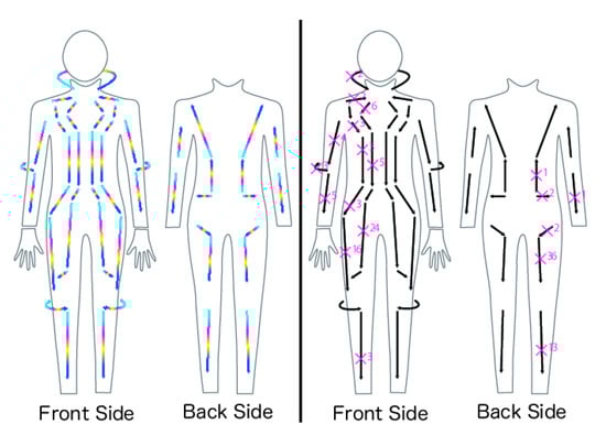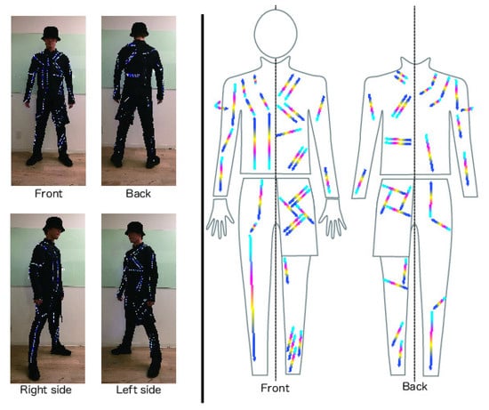 We fabricated an experimental costume that has the new LED layout mentioned in Section 8 on the left half, and the older LED layout that was created in 2014 on the right half. The dancer wore this costume and danced freely. The experimental costume is shown in Figure 11. The costume fabricated in 2015 is the latest costume (Figure 2), which is a jumpsuit. Thus, in this endurance test, the LED layout created in 2014 was adopted due to use the same type of costume along with our proposed design guideline. When dancing, the observer turned on the LEDs every five minutes to check for failures. If a failure occurred, the position of the broken LED was recorded. After repairing it, the experiments restarted. The dancers have been dancing for 10 years (180 cm in height and weighing 68 kg) and have worked as a dancer for well-known artists in the past and have experience wearing LED costumes. This experiment was conducted for 1 h a day, for a total of 10 h for 10 days. The past concerts we participated in were held more than 20 times. Therefore, this endurance test time is equivalent to 20 concerts involving 30-min dance performances.