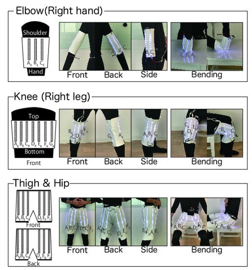 The damaged LED was clearly identified at the beginning of the experiment. Therefore, this is the number of times that the damaged LED was broken. The elbow exercise was 2000 times, knee exercise 2500 times, and thigh and hip exercise 2000 times. The LED units that did not break are described as ’No breakage’. The LED units located on the side of the elbow, and , and on the side of the knee, , , , and , fractured at the elbow and knee joints, and pressure was applied to the inflexible short side direction of the LED unit, which caused the fractures. The LED units located at of the elbow and and of the knee did not break. These LED units were attached along the direction of the bending joints. At the thigh and hip, all LED units located at the front of the body broke. The front of the short pants wrinkled at the groin, and pressure was applied to the LED units because of that wrinkle. When standing up, the upper body has to be bent a little forward, which also puts pressure on the LEDs located at the groin. At the hip, the LED units except did not break. These LED units were located along the direction to the bend in the hip and were not damaged. For the same reason as the elbow and knee, the LED unit located at the side of the joint easily fractured. This is why the LED unit located at fractured. Although the LED unit at symmetrical with that at did not break, it was more damaged than the others due to repeated bending and stretching.