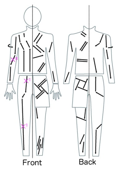 The LED layout on the costume and the positions of the broken LED units are shown in Figure 4. The left side is the LED layout, which included 907 LEDs and 62 LED units. Each LED unit is denoted with an arrow. The right side is the positions of broken LED units, represented with symbols. The notation symbol denotes the broken LED position, and N denotes the number of the broken LED unit. The LED layout on this costume is symmetrical. Depending on the dance, there is a possibility that the degree of breakage on both sides is different. However, not the influence of the dance, but the influence of the design of the costume itself, is being investigated. Therefore, we marked the broken LED position only on the right half of the body. The most broken position was around the hip, on which there were 36 instances of broken LED units. This was because they were bent repeatedly during dancing. The LED units around the front thigh also fractured frequently. There were 17 LEDs in these LED units, which was longer than the other LED units and frequently bent and stretched while dancing, which caused fractures. The LED units around the tips of the arms and legs frequently broke. This was due to the body size of the dancer. When a shorter dancer wore a large LED costume, those LEDs fractured. In particular, the LED unit on the leg was so long that it bent around the ankle. During long concerts, the dancers who were going to wear LED costumes often changed by the concert date. Therefore, shorter dancers may sometimes have to wear a little larger LED costumes.